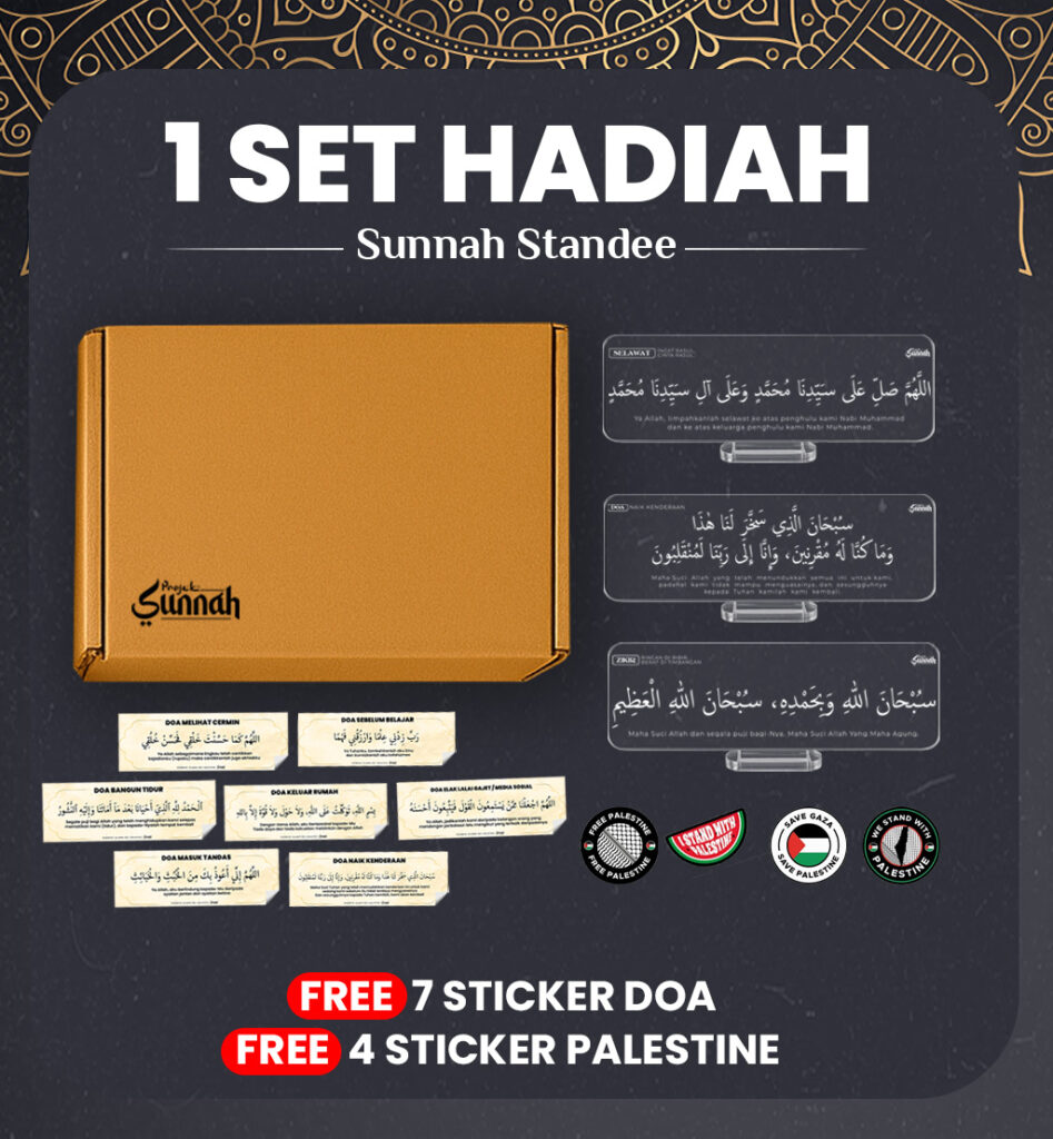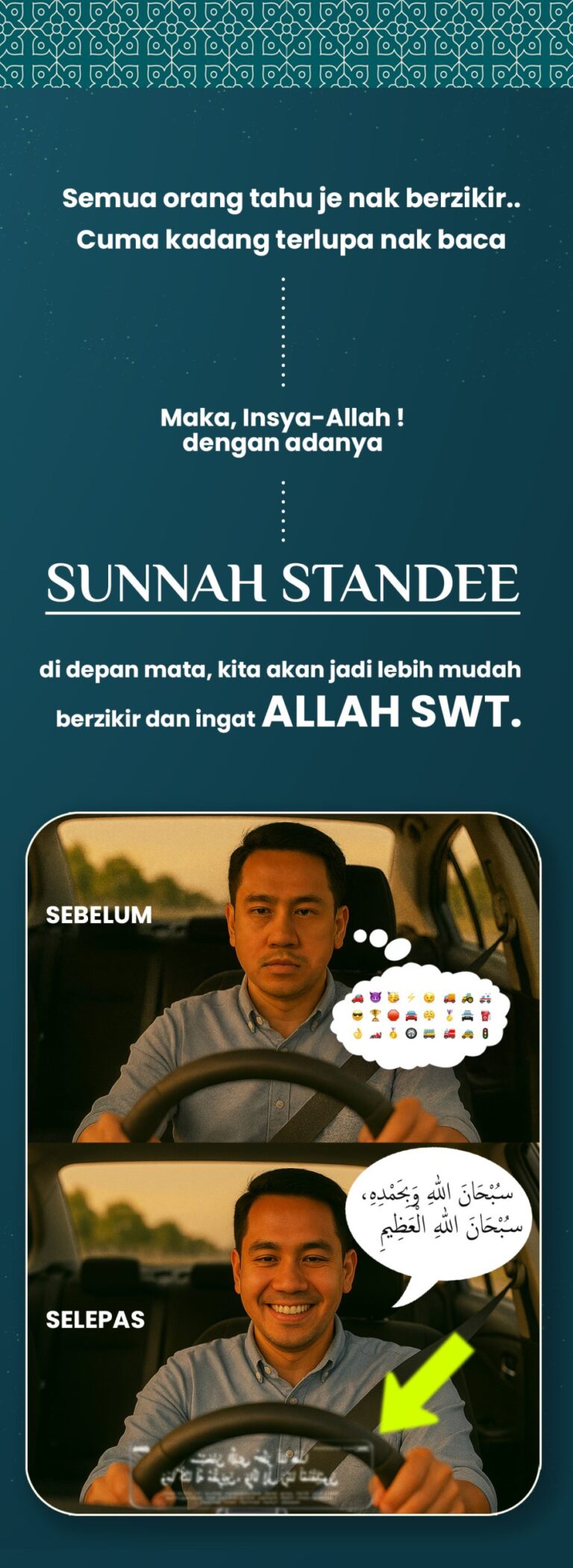 Sunnah Standee adalah produk hiasan & peringatan berbentuk acrylic yang memaparkan doa dan zikir harian. Ia bukan peranti elektronik, bukan alat bacaan Al-Quran, dan bukan juga pengganti kitab atau guru bertauliah. Tujuan utama produk ini adalah sebagai peringatan visual untuk menggalakkan amalan zikir & doa dalam kehidupan seharian.